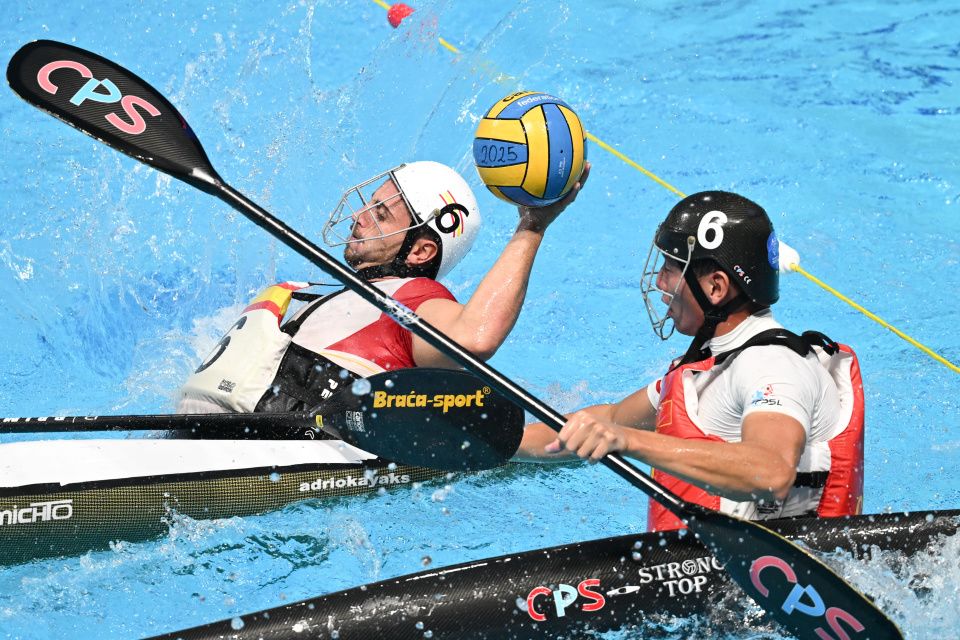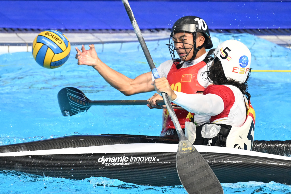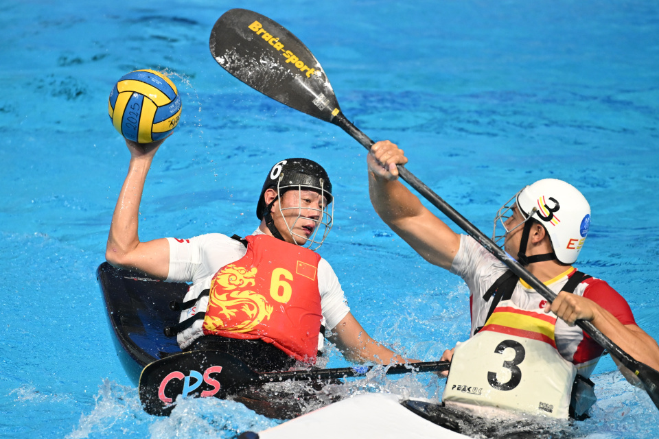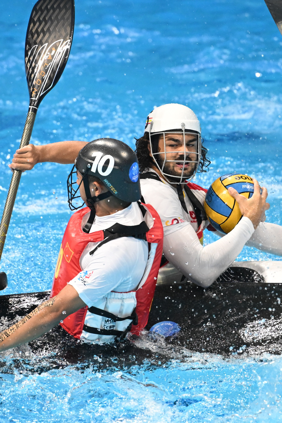当日,在2025年成都世运会皮艇球男子第5-8名安慰赛半决赛的比赛中,中国队不敌西班牙队。8月15日,中国队球员陈荣(左)在比赛中。新华社记者 陈振海 摄